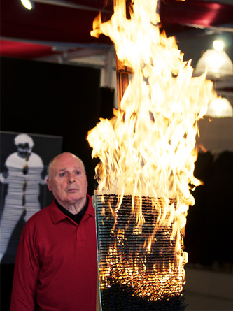 Aubertin decide di sì ma lo fa abolendo ogni figurazione, scheletrizzando l’opera pittorica sino a rosso. Niente altro che rosso. Un Rosso totalizzante ed annichilente allo stesso tempo! Dopo i grandi monocromi rossi degli anni 60, l’opera non poteva altro che bruciare e così Hopper Ten comincia a dipingere con il fuoco, con il fumo, con la combustione.